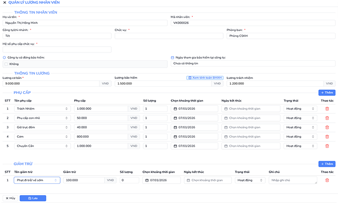 Quản lý phụ cấp, thưởng, khấu trừ
